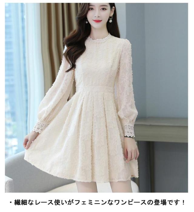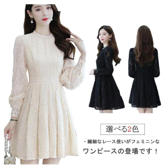 総レース ワンピース ミニワンピース フレアワンピース 長袖 パールネック Aライン 膝丈 結婚式 パーティードレス きれいめ 二次会 大人可愛い 春 秋 無地 全2色