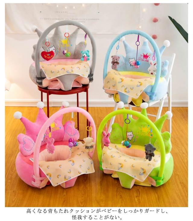 | 可愛いぬいぐるみや鈴付きで遊びながらお座り練習に。お手入れが簡単なベビーチェアです。 赤ちゃんを優しく包み込むふわふわベビーソファー、お子様のお座り練習に最適。 赤ちゃんが前倒れしにくい、低座面定重心構造で安定した座り心地です。 ベビーソファーを汚れないようにハンカチ付き! 高くなる背もたれクッションがベビーをしっかりガードし、怪我することがない。 しっかりお座りをさせたい、ママが一息したい時、散髪の時や離乳食の時にとっても便利なベビーソファです! | |