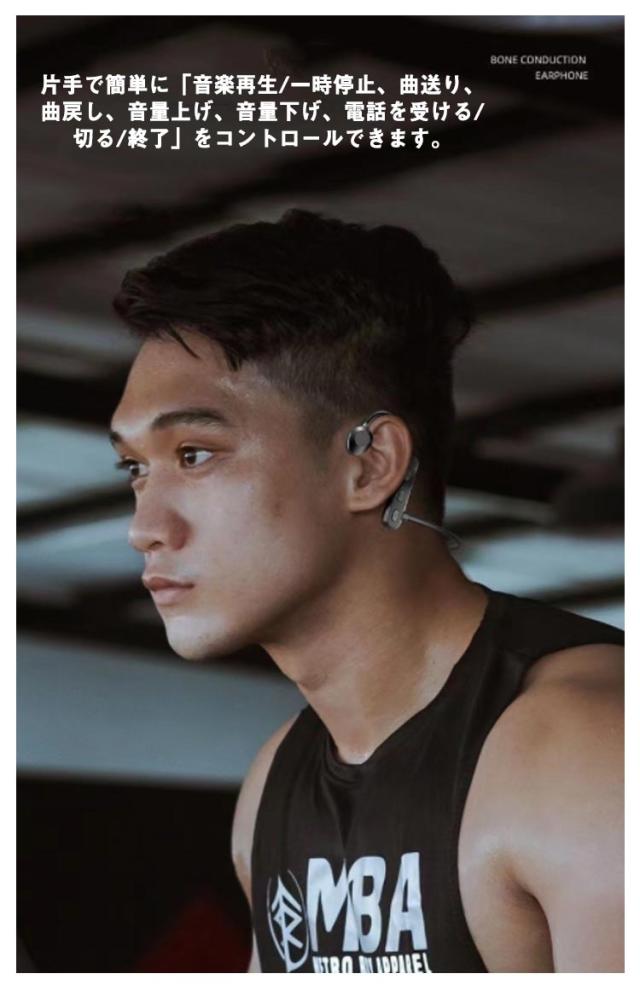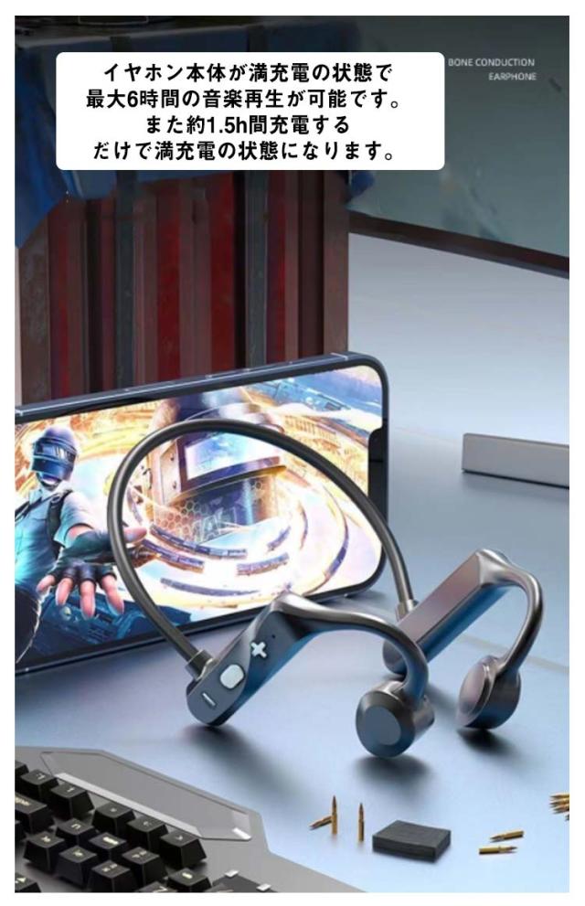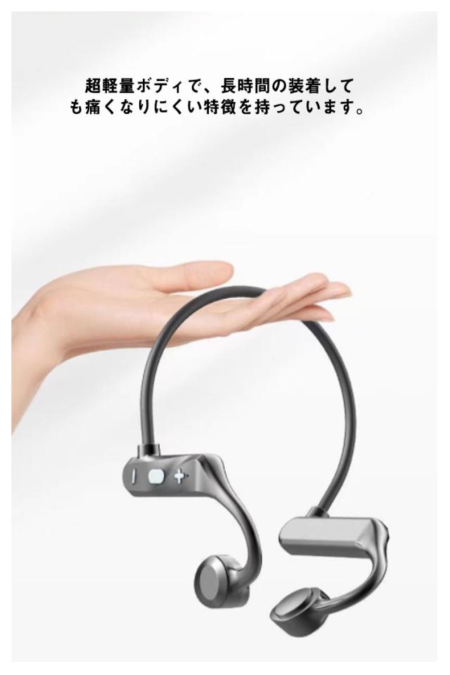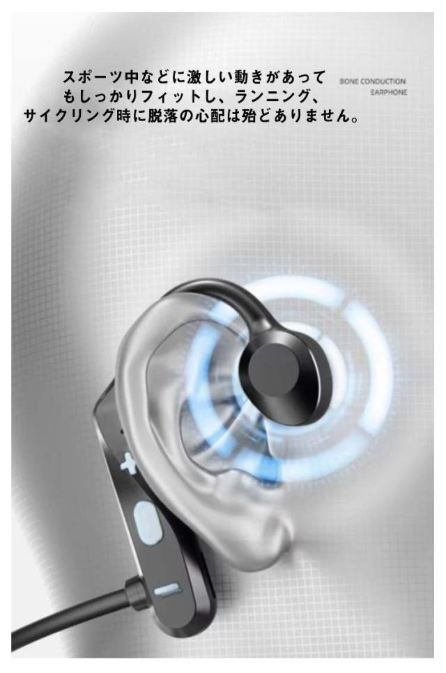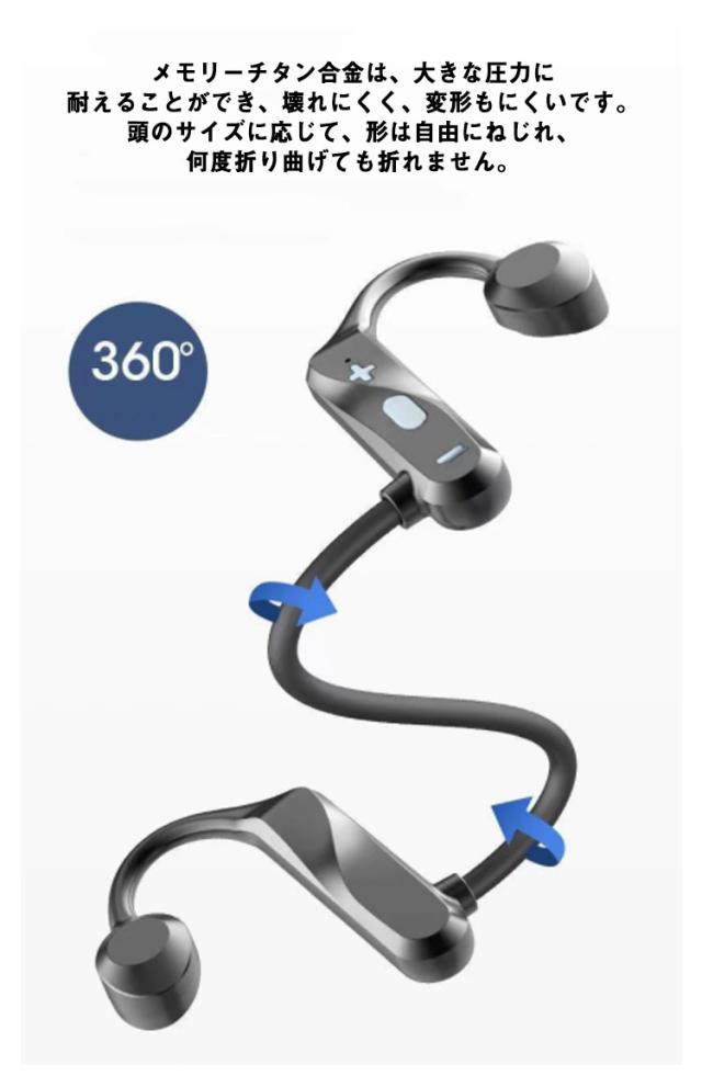 | 耳を塞がない骨伝導イヤホン・より健康&安全! 耳の近くから内耳に微細な振動を伝える骨伝導仕様で、イヤホンを耳道に入らず、高音の刺激から聴力を保護。 Bluetooth5.2を搭載し、通信速度、通信距離、安定性が飛躍的に向上 IPX7防水規格で汗をかいても突然の雨でも快適なつけ心地がよく、安心して使用することが可能です。 イヤホン本体が満充電の状態で最大6時間の音楽再生が可能です。また約1.5h間充電するだけで満充電の状態になります。 超軽量ボディで、長時間の装着しても痛くなりにくい特徴を持っています。 片手で簡単に「音楽再生/一時停止、曲送り、曲戻し、音量上げ、音量下げ、電話を受ける/切る/終了」をコントロールできます。 長時間稼働可能で、通勤通学、テレワーク、スポーツなどさまざまな場面での使用可能です。 スポーツ中などに激しい動きがあってもしっかりフィットし、ランニング、サイクリング時に脱落の心配は殆どありません。 メモリーチタン合金は、大きな圧力に耐えることができ、壊れにくく、変形もにくいです。頭のサイズに応じて、形は自由にねじれ、何度折り曲げても折れません。 リモコン機能: (+/-ボタン)1回押し:曲送り(次の曲のスキップ) (電源ボタン)1回押し:電話の応答・拒否、音楽の再生/一時停止 (-ボタン)2回押し:Siri起動 (+/-ボタン)長押す:音量調整 (電源ボタン)3秒押す:オン・オフ | |