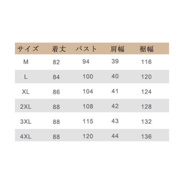 | サイズについての説明 | サイズ:単位cm/kg M 着丈82 バスト94 肩幅39 裾幅116 適応体重45-52.5 L 着丈84 バスト100 肩幅40 裾幅120 適応体重52.5-57.5 XL 着丈86 バスト104 肩幅41 裾幅124 適応体重57.5-62.5 2XL 着丈88 バスト108 肩幅42 裾幅128 適応体重62.5-67.5 3XL 着丈88 バスト115 肩幅43 裾幅132 適応体重67.5-75 4XL 着丈88 バスト120 肩幅44 裾幅136 適応体重75-85 5XL 着丈88 バスト125 肩幅45 裾幅140 適応体重85-90 |