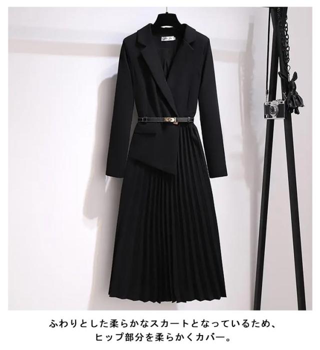 | 一枚でも着やすいエレガントワンピ スカートはカジュアルとしても使用できるのでコーデアイテムとしても活躍。 ふわりとした柔らかなスカートとなっているため、ヒップ部分を柔らかくカバー。 ジャケットがVネックになっているため、首元をキレイに見せてくれます。 | |