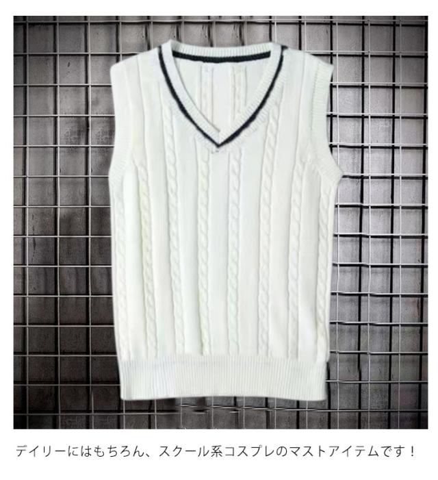 | スクールやオフィスで大活躍のニットベストです♪ フィット感が癖になる着心地の良いニットを使用します。 インナーのシャツの襟がきれいに見える計算されたVネックデザイ。 デイリーにはもちろん、スクール系コスプレのマストアイテムです! | |