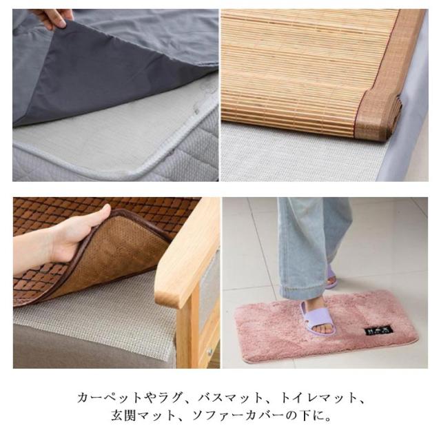 | 強力グリップの滑り止めマットです。 敷くだけで抜群のズレ防止効果を発揮する。 折り畳みの形でとても便利で、ハサミでお好みのサイズにカットできます。 カーペットやラグ、バスマット、トイレマット、玄関マット、ソファーカバーの下に。 食器棚や引き出しの中、花瓶やキーボードの下に。 ワインボトルやガラス瓶などの割れ物に巻いておけば、安心して持ち運ぶことができます。 車のダッシュボードに敷いて、スマホや鍵を置いたときの落下防止に。 水や、中性洗剤で洗えますので、繰り返し使えます よく乾燥させて、繰り返し使用することができます。 | |