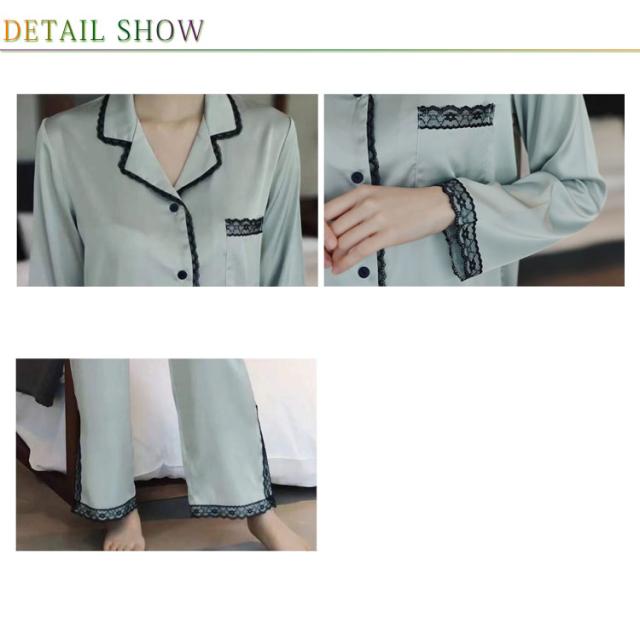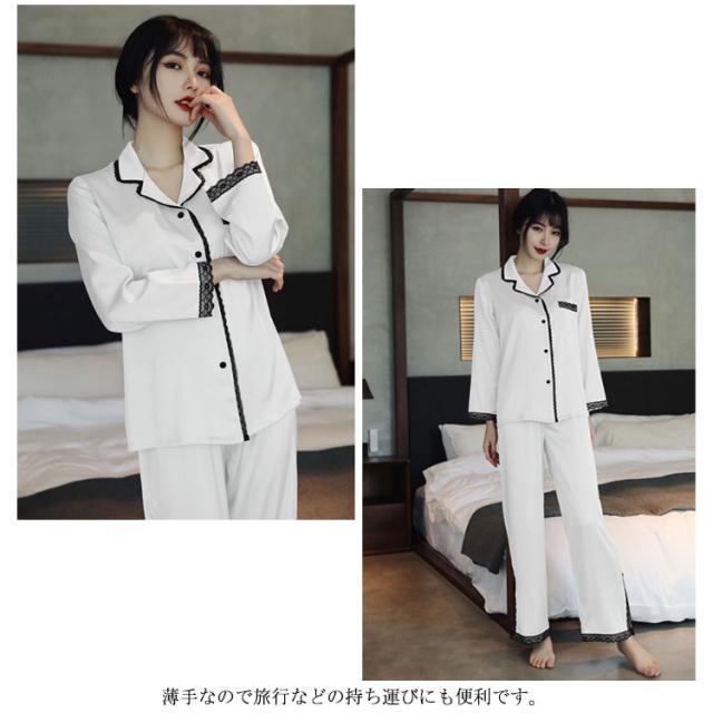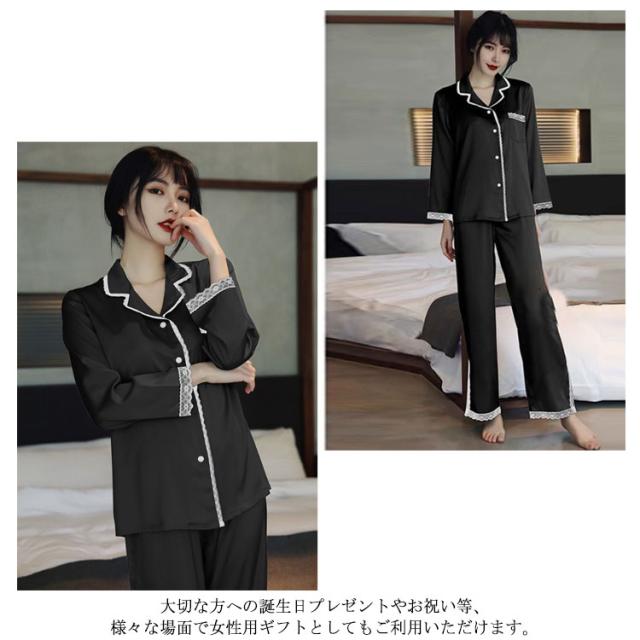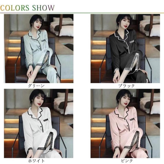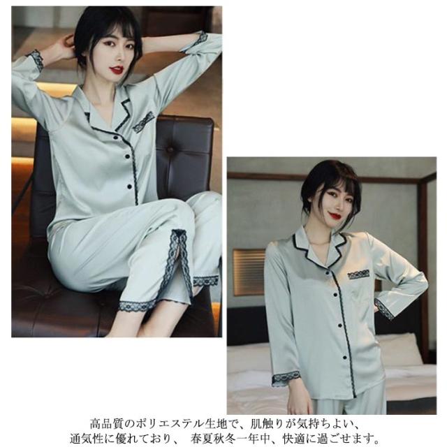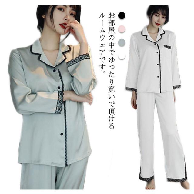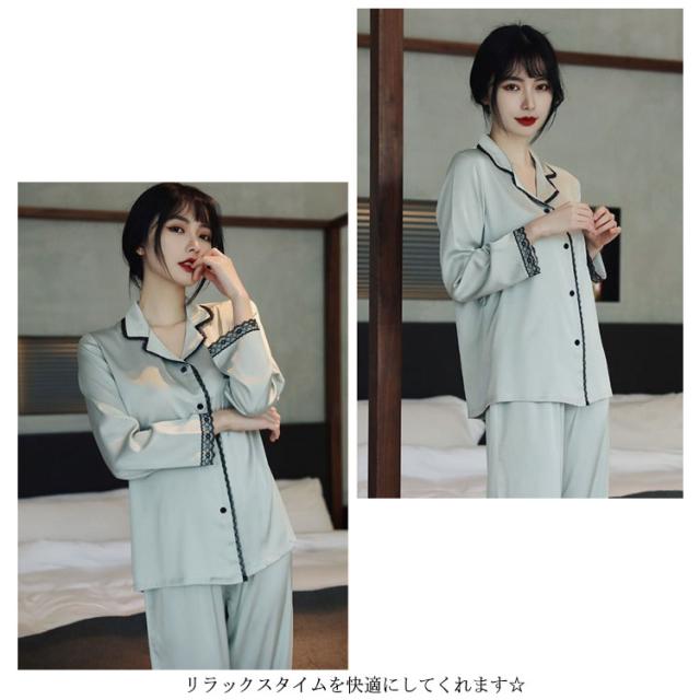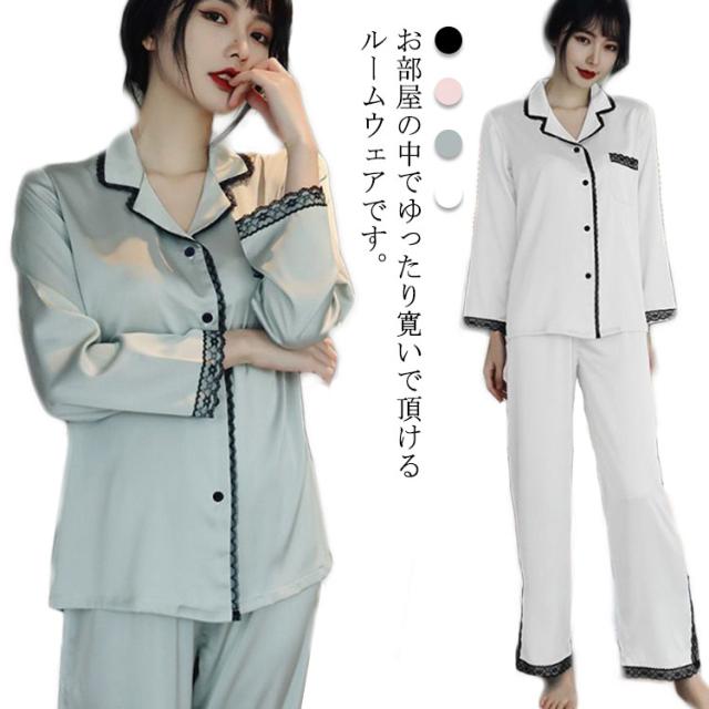 パジャマ レディース サテン調 長袖 ルームウェア 上下セット シルクタッチ レース 春 夏 秋 かわいい おしゃれ 前開き リラックスウェア 部屋着 寝巻き 襟付き 大きいサイズ ロングパンツ