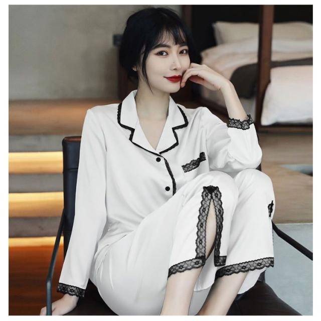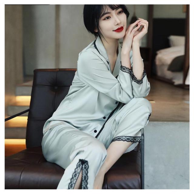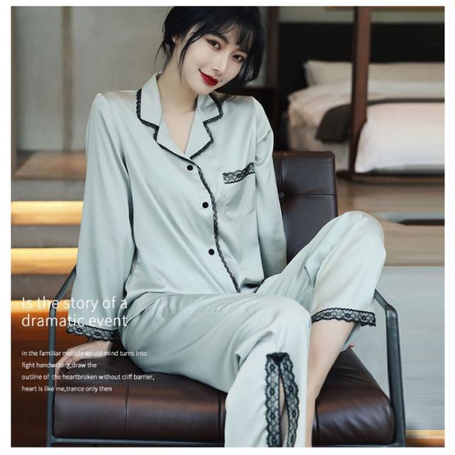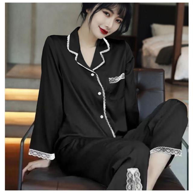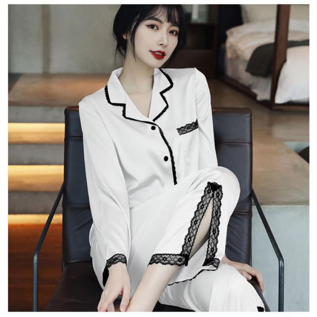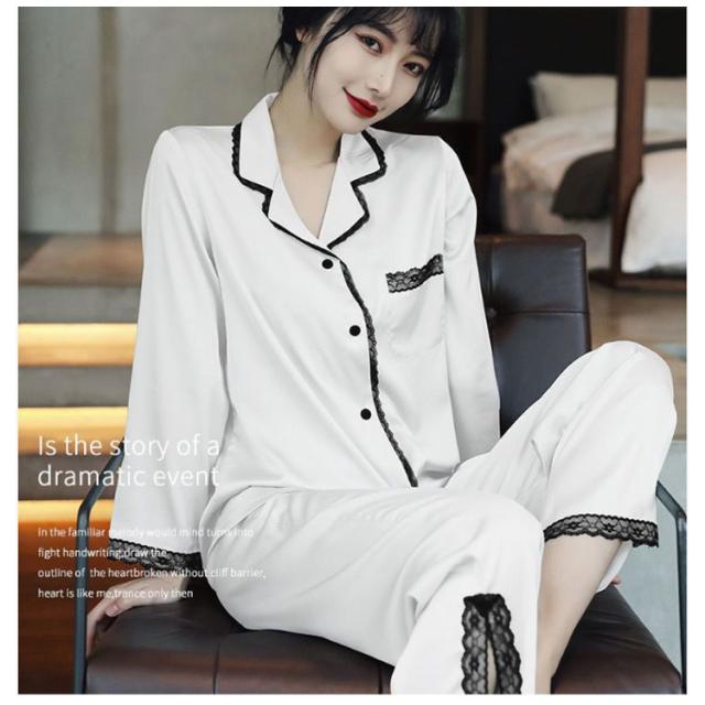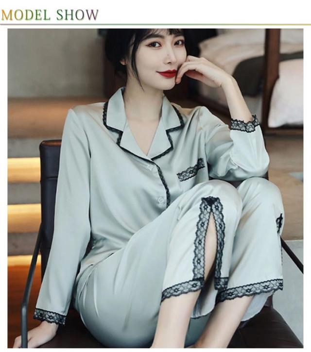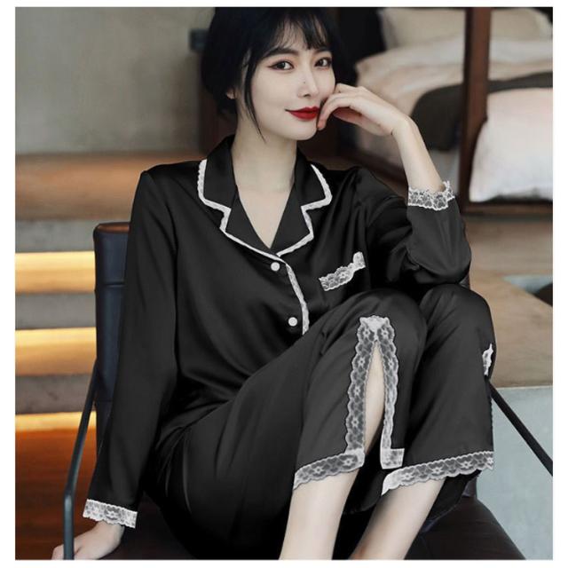 パジャマ レディース サテン調 長袖 ルームウェア 上下セット シルクタッチ レース 春 夏 秋 かわいい おしゃれ 前開き リラックスウェア 部屋着 寝巻き 襟付き 大きいサイズ ロングパンツ