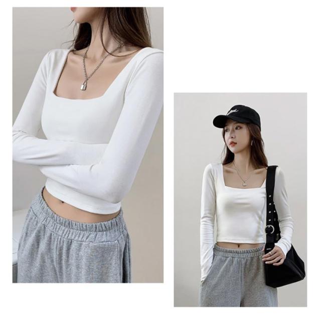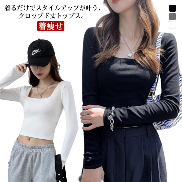 送料無料 Tシャツ レディース スクエアネック 春秋 カットソー 長袖Tシャツ へそ出し 着痩せ ショート丈 タイト 着回し tシャツ スリム 無地 シンプル 大人 カジュアル 韓国ファッション トップス お出かけ