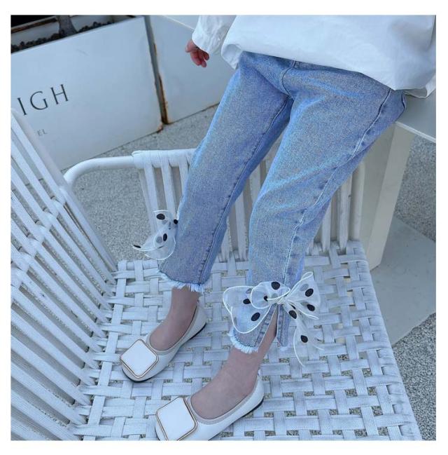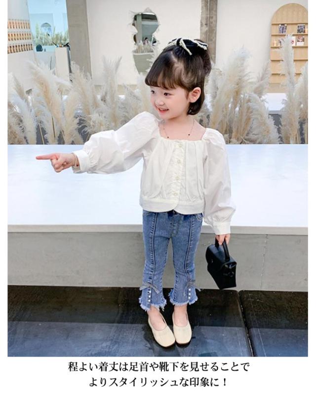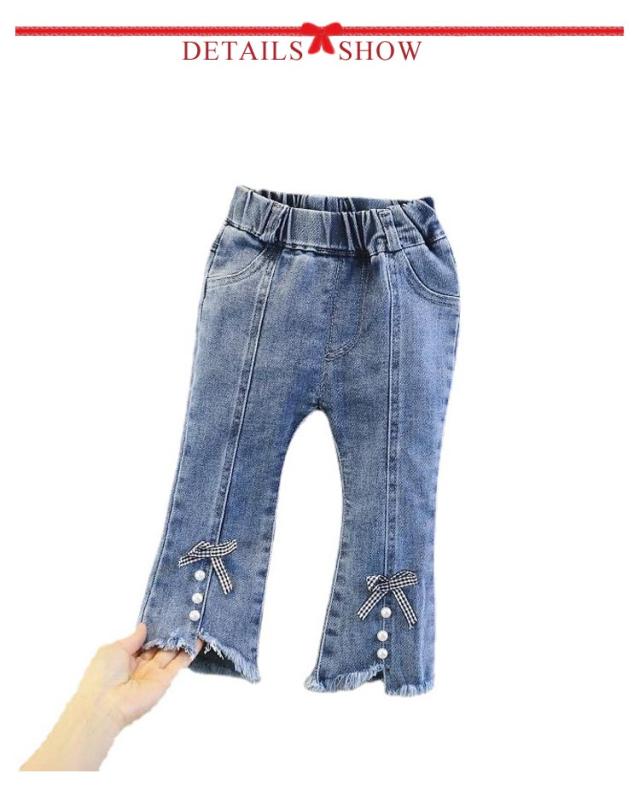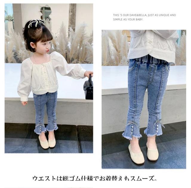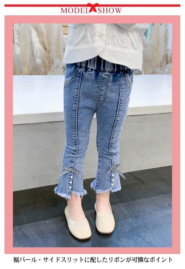 子供 デニム パンツ フレアパンツ ダメージ ジーンズ ボトムス ジーパン キッズ 女の子 ロングパンツ 裾リボン ベビー 80〜130cm カジュアル おしゃれ 可愛い 子ども服 春 秋 韓国子供服 ストレッチ 送料無料