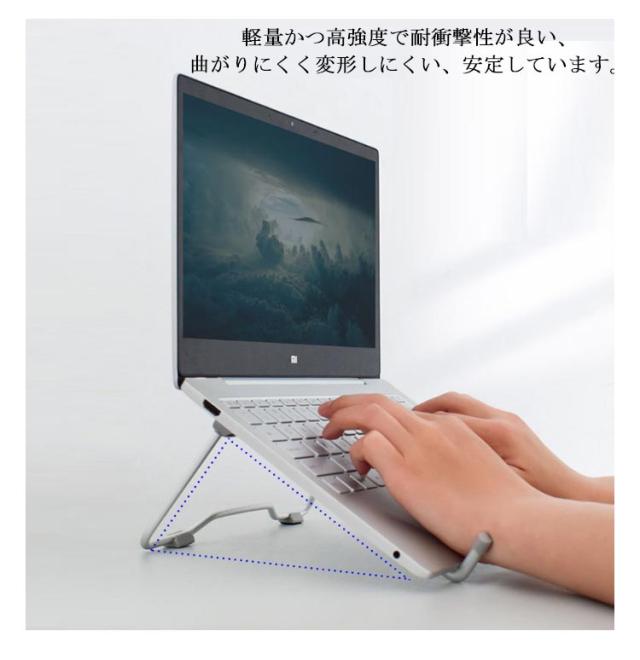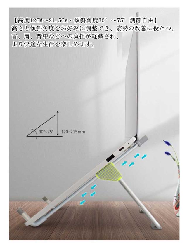 | 超軽量ノートパソコンスタンド(ノートPCスタンド)です!17インチまでのノートPCやタブレットを幅広く対応可能です。 【高度12CM〜21.5CM・傾斜角度30°〜75°調節自由】高さと傾斜角度をお好みに調整でき、姿勢の改善に役たつ、首、肩、背中などへの負担が軽減され、より快適な生活を楽しめます。 【放熱効果抜群アルミ合金素材】本体は肉厚のアルミニウム合金で出来上がり、放熱効果抜群。軽量かつ高強度で耐衝撃性が良い、曲がりにくく変形しにくい、安定しています。 【滑り止め・保護パッド】低重心により、PCスタンドの底部と両側と爪の内側とにはシリコーン製のパッドが付いて、滑り止めだけでなく、大事なパソコンを傷つけようなことを防止できます。 【折りたたみ式・収納スペースに困りません】折りたたみ可能な仕様で、収納スペースに困りません。持ち運びにも便利でどこでも便利に使えます。 | |