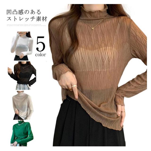 シースルー シアー カットソー レディース メロウフリル フリルネック 透け レース タートルネック 長袖 トップス 春 夏 秋 セットインスリーブ お洒落 可愛い 薄手 重ね着 レイヤード 無地 オフィス カジュアル エレガント ママ 普段着 OL 通勤 通学 黒 白