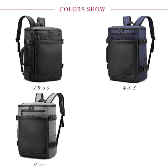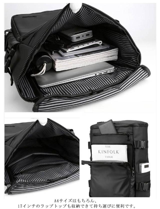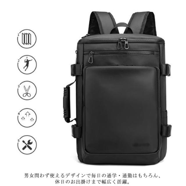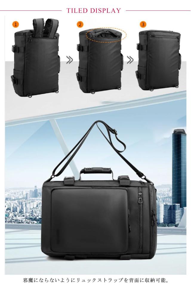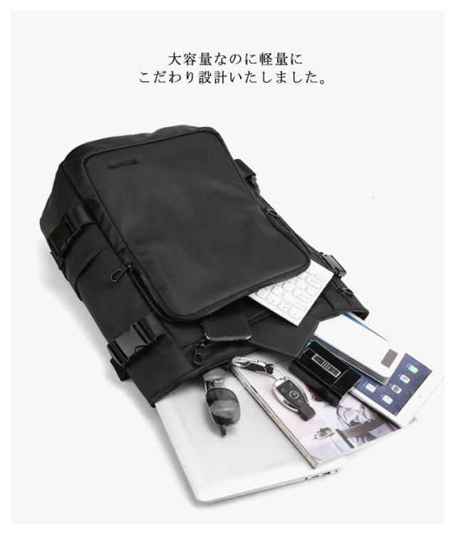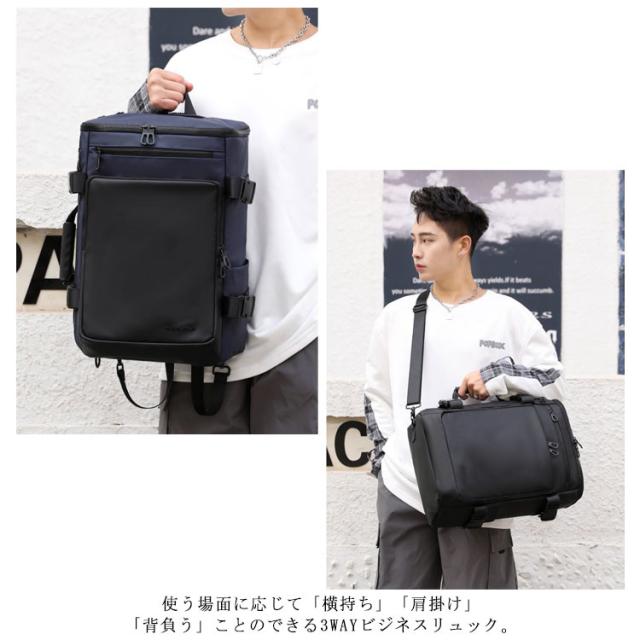 | 使う場面に応じて「横持ち」「肩掛け」「背負う」ことのできる3WAYビジネスリュック。 邪魔にならないようにリュックストラップを背面に収納可能。 大容量なのに軽量にこだわり設計いたしました。 A4サイズはもちろん、 17インチのラップトップも収納できて持ち運びに便利です。 男女問わず使えるデザインで毎日の通学・通勤はもちろん、休日のお出掛けまで幅広く活躍。 | |
