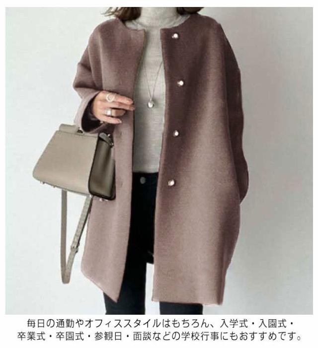 | 上品なノーカラーコートの登場。起毛感のあるフェイクウール素材が上質な印象を醸し出します。 ミニマムでトレンドの左右されにくいスタイルなので、どんなコーディネートにもマッチします。 程よい厚みのフェイクウール素材、ライトな着心地も嬉しいポイント。 軽アウターとして春先まで重宝します。ヒップの隠れる丈なので、しっかり暖かく体型カバーも期待出来ます。 毎日の通勤やオフィススタイルはもちろん、入学式・入園式・卒業式・卒園式・参観日・面談などの学校行事にもおすすめです。 | |