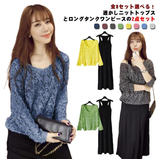 全8セット選べる!春服 セットアップ 透かしニットトップス タンクワンピース 2点セット レディース ワンピース ロング丈 ノースリーブワンピース 透け編み ニットソー レイヤード 旅行 カジュアル 春 秋 送料無料