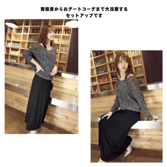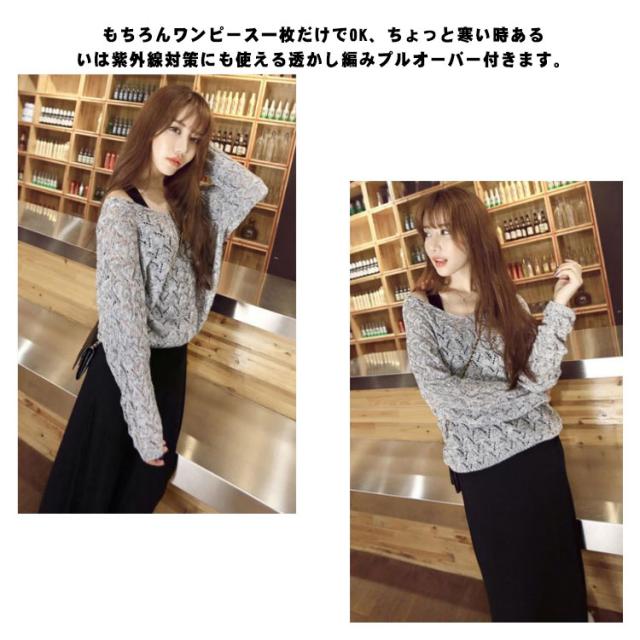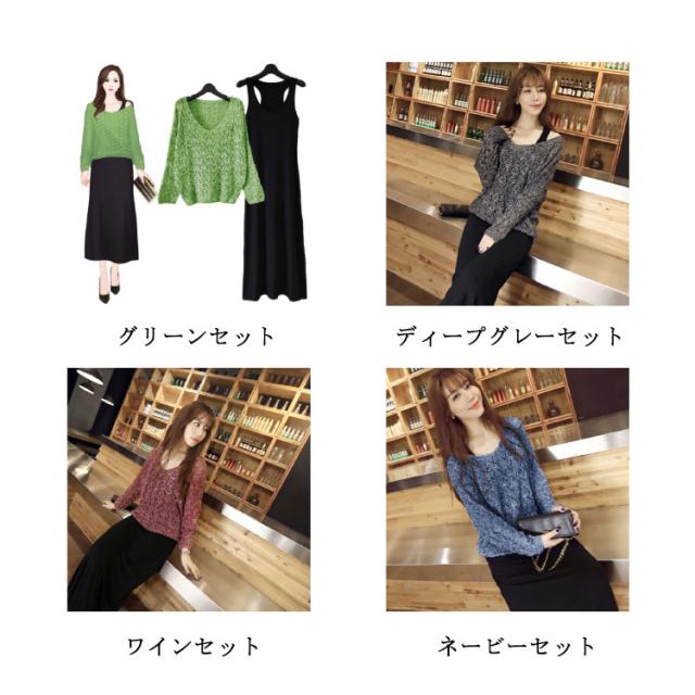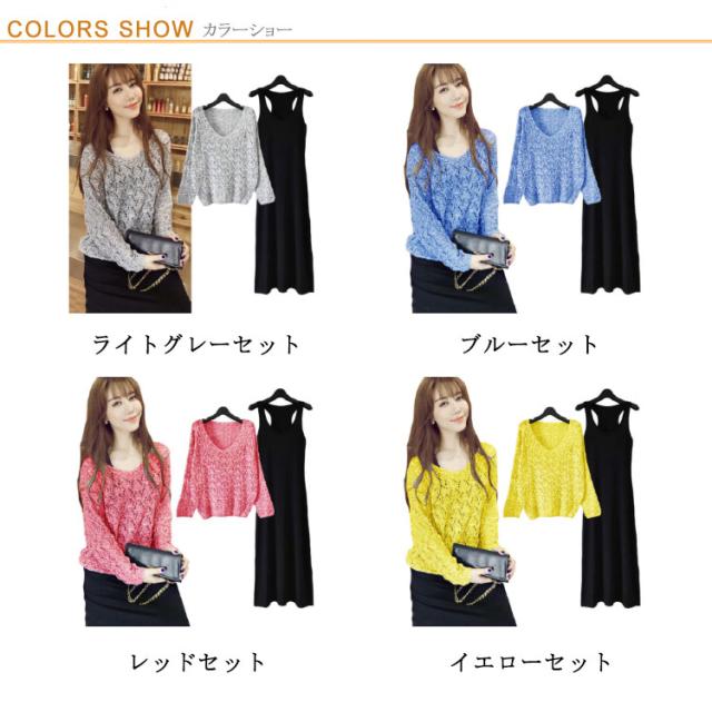 | 全8セット選べる!透かしニットトップスとロングタンクワンピースの2点セット。 もちろんワンピース一枚だけでOK、ちょっと寒い時あるいは紫外線対策にも使える透かし編みプルオーバー付きます。 ふくらはぎまでも隠れるロング丈ワンピースで肌が露出するに苦手な方にもオススメ。 普段着からおデートコーデまで大活躍するセットアップです。 | |
