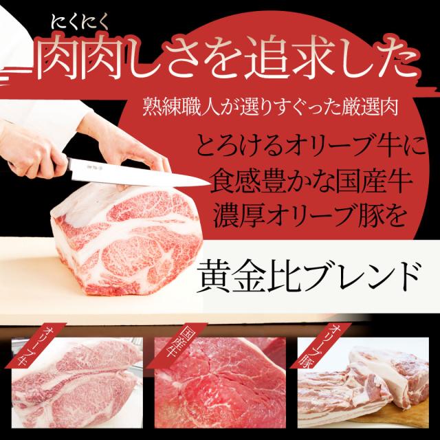 肉肉しさを追求したオリーブ牛にうまみカルビオリーブ豚を黄金比ブレンド