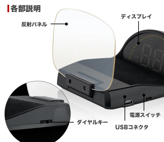 内容物:ヘッドアップディスプレイ本体×1、OBDIIケーブル(1.7m)×1、USBケーブル(2.4m)×1、設置用マット(再利用可能)×1、日本語マニュアル×1