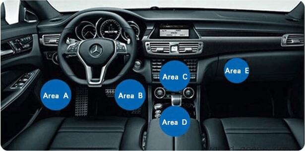 OBDIIコネクタの位置は車種やメーカーによってさまざまです。多くの場合は下図の青い丸の部分のいずれかにありますが、よく分からない場合はディーラーにお尋ねになるか、インターネットで「(車種名+年式) OBDII」等のキーワードで検索しご確認ください。