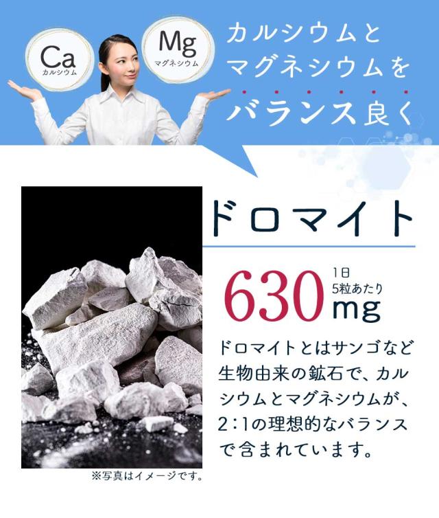 ドロマイト(ドイツ製造)、海藻末、還元麦芽糖水飴、デキストリン、酵母(亜鉛含有)、酵母(マンガン含有)、酵母(クロム含有)、酵母(ヨウ素含有)、酵母(銅含有)、酵母(セレン含有)、酵母(モリブデン含有)/結晶セルロース、クエン酸第一鉄ナトリウム、ステアリン酸Ca、微粒酸化ケイ素、クエン酸、ビタミンD