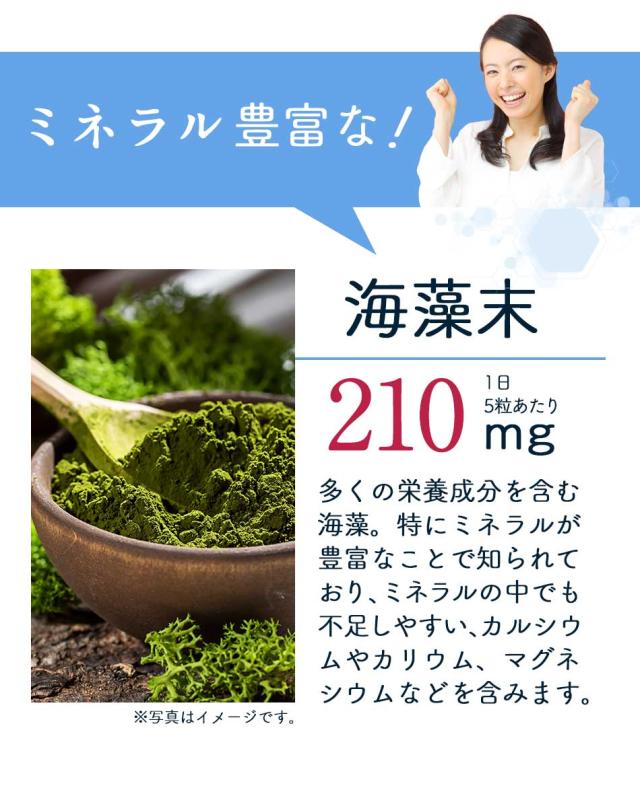主要原料(1粒あたり):海藻末 42mg / 酵母(亜鉛含有) 6mg / 酵母(マンガン含有) 6mg / 酵母(クロム含有) 3mg / 酵母(ヨウ素含有) 2.859mg / 酵母(銅含有) 2.4mg / 酵母(セレン含有) 2.31mg / 酵母(モリブデン含有) 1.701mg