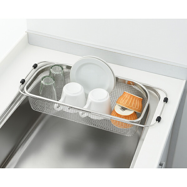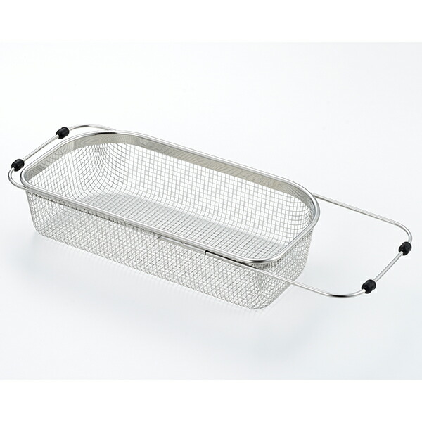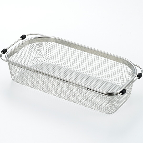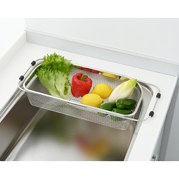 シンクの端に沿った形状なので、シンク内のスペースを無駄なく使えます。シンクに合わせて調整できるスライド式。網が細かいので小物の水切りにも便利です。食器はもちろん、野菜の水切りにも。
