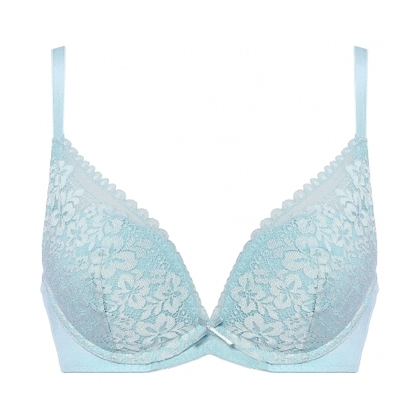 ディープVシルエットで“前中心が低く、カップ脇の高いパターン”と“バストを前中心に集める底厚のモールドカップ”できれいな谷間を作ります。