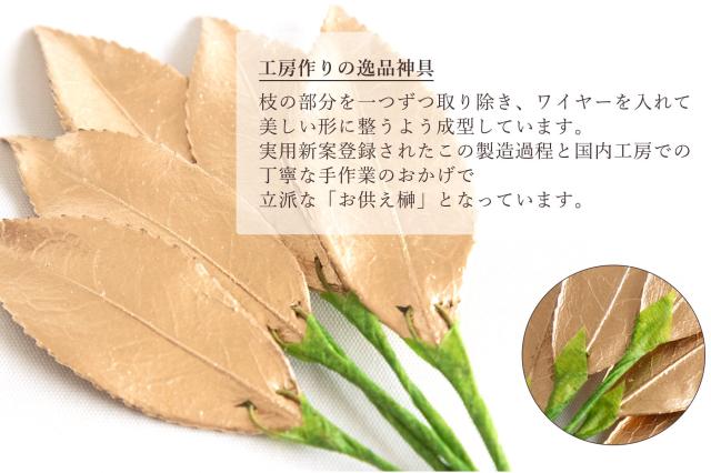 工房作りの逸品神具 枝の部分を一つずつ取り除き、ワイヤーを入れて美しい形に整うよう成型しています。実用新案登録されたこの製造過程と国内工房での丁寧な手作業のおかげで立派な「お供え榊」となっています。 |