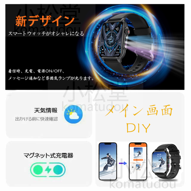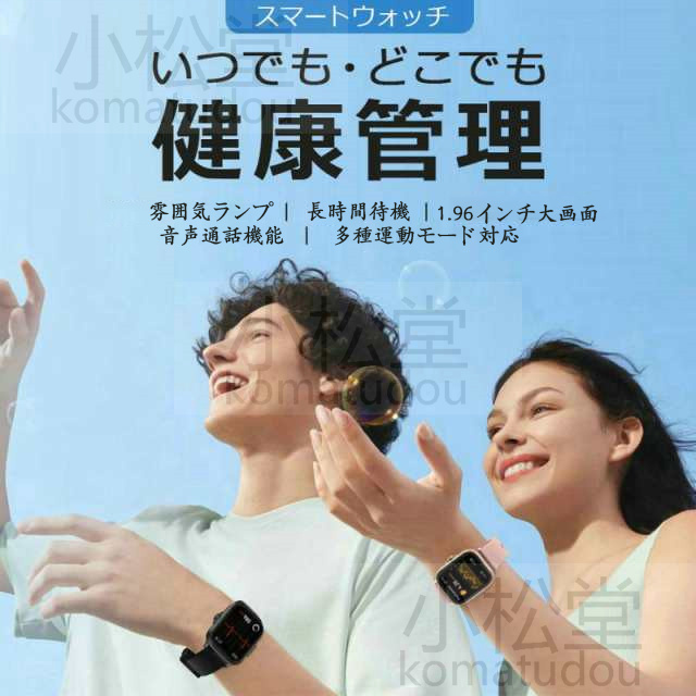 【高級感溢れる曲面スクリーン&超軽量薄型】 スマートウォッチが1.96インチ大画面を採用して、驚くほど鮮明で、美しくリアルな画面を実現しました。画面の明るさ調節も可能で、強い日差し下にも視認性が高く、見やいです。 腕上げ点灯機能で、腕の振り上げ動作でスマートウォッチの画面が自動点灯するので、時刻を確認する時に便利です。 ?薄と超軽量の設計で、運動中も負担にならず超快適に装着できるスマートウォッチ、 レディースにもメンズにも適します。