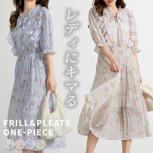 春新作 ワンピース 夏 レディース プリーツ 五分袖 ロング ワンピ おしゃれ かわいい きれいめ 大人 清楚 白 フリル 花柄 フラワー 上品 サマーワンピ バルーンスリーブ キーネック リボン フェイクボタン ウエストゴム 薄手 透け感 裏地あり
