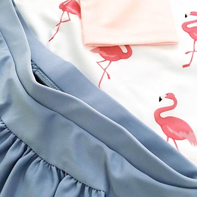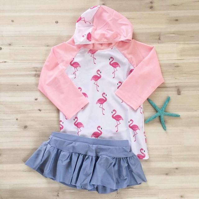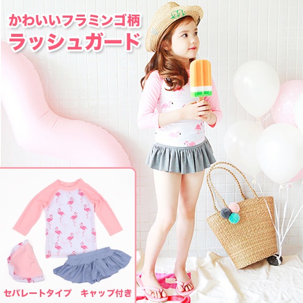 ラッシュガード 子供用 水着 長袖 上下セットキャップ付 帽子 フラミンゴ柄 動物 鳥 アニマル キッズ パステルカラー