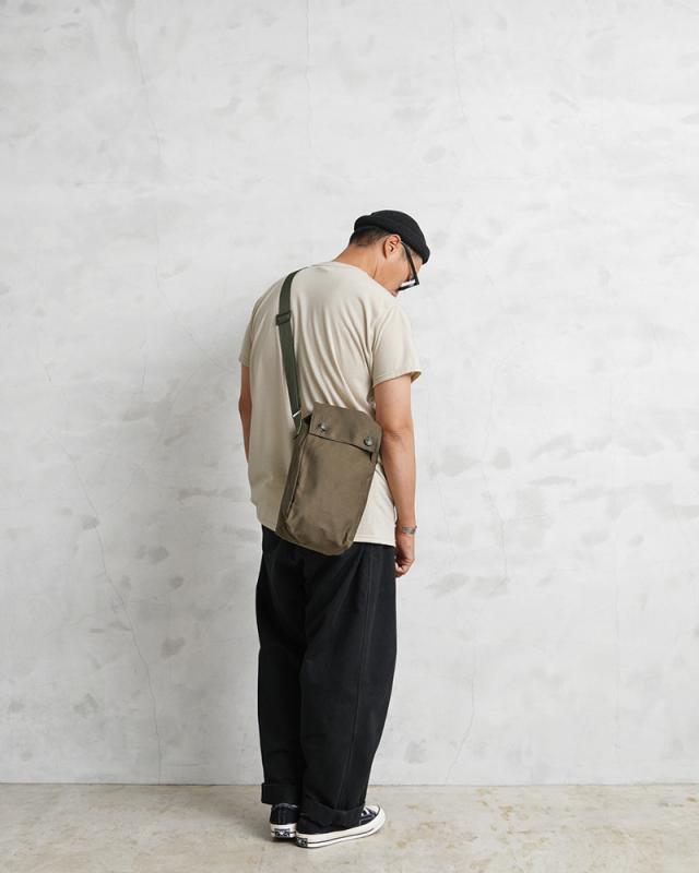 チェコ軍が1980年代頃に使用していた、保護マスクを収納するためのショルダーバッグです。縦に長い形状で、丈夫なキャンバス生地。バックルで長さ調節可能なショルダーストラップ、腰の位置で固定できるサブストラップも備えています。フラップに付けられたチェコ軍の双剣マーク(クロスソード)が入ったボタンが目を惹きます。たっぷりと高さがあるので、1リットル以下のペットボトルであれば余裕で入り、A5サイズノート、タオル、スマホ、財布など十分入る日常使いに重宝するサイズ感。旅行用のサブバッグとしてや瓶などの飲み物の買い出しに最適です。