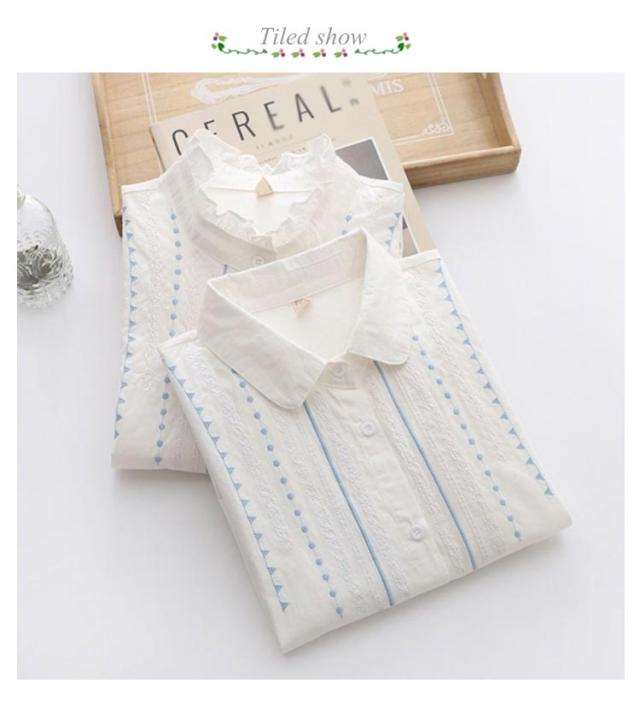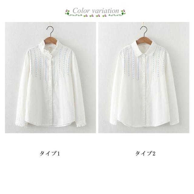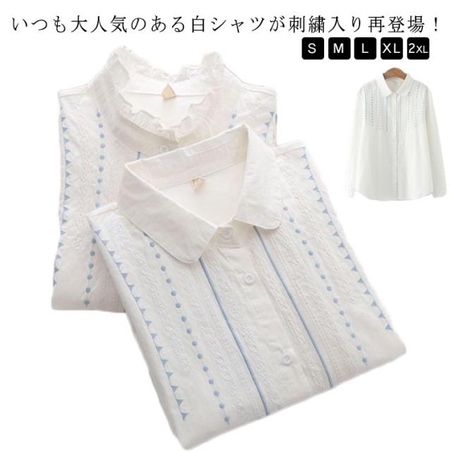 シャツ ブラウス レディース 白シャツ 送料無料 刺繍 トップス 長袖 春服 秋服 フリルシャツ コットン ナチュラル キレイめ 大人 女子