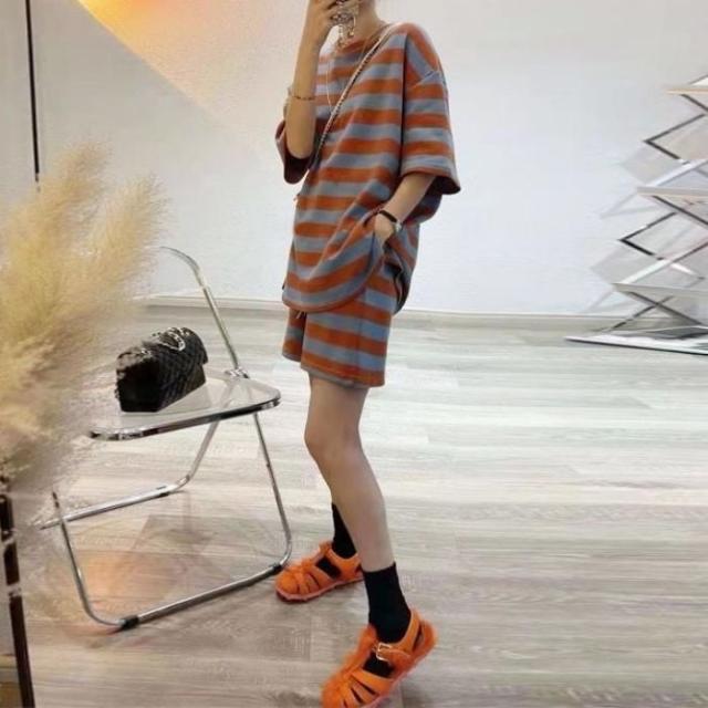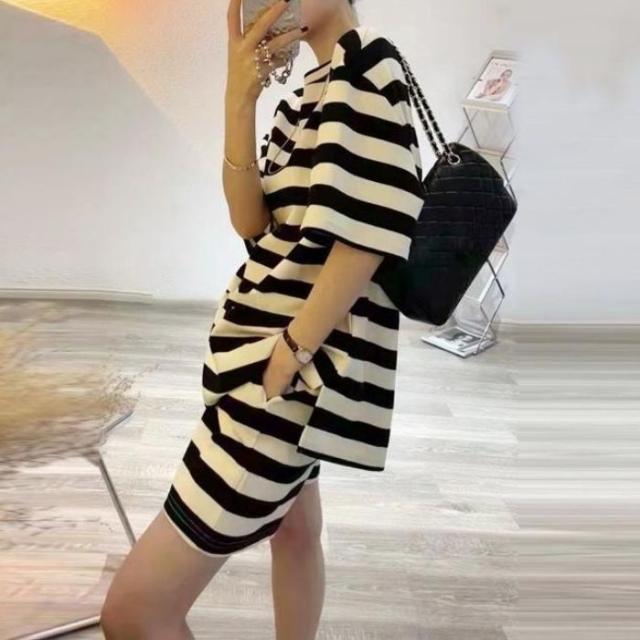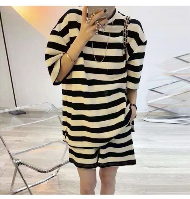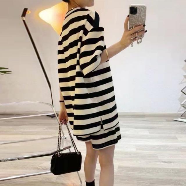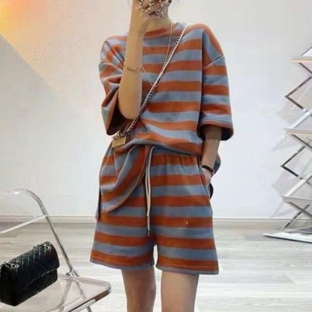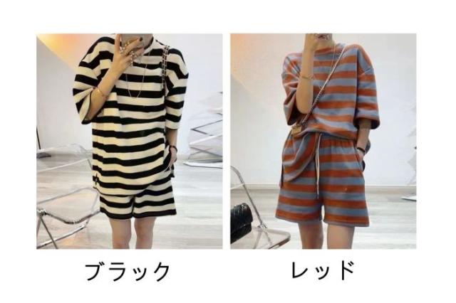 セットアップ レディース tシャツ ショートパンツ スウェット 上下セット 半袖 ストライプ ゆったり 夏