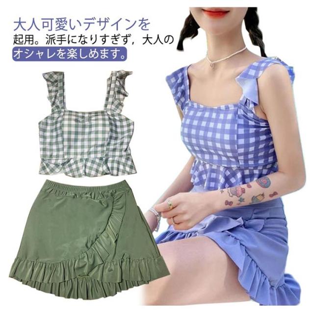 水着 レディース 2点セット セパレート チェック柄 フリル 女の子 大きいサイズ 高校生女子 中学生 可愛い 体型カバー パッド付き 10代 20代 中学生 高校生 海水浴 潜水 海 ビーチ 韓国 可愛い レディース 大きいサイズ フィットネス 送料無料