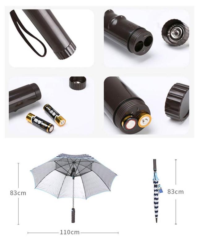 | サイズについての説明 | F 全長:約83cm 直径:約110cm 中骨:8本 使用電源:単3乾電池×2本 |