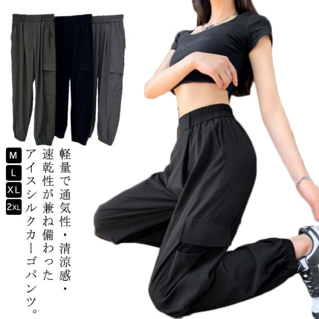 カーゴパンツ アイスシルク パンツ レディース 冷感 夏パンツ 薄い ウェストゴム メンズライクカーゴパンツ 涼しい 春夏 アメカジ ミリタリーパンツ ダンス衣装 ヒップポップ ゆるパンツ ワイド ルーズ ズボン