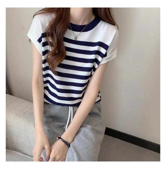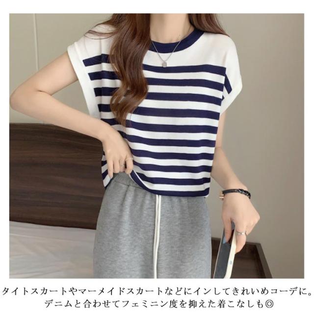 サマーニット トップス フレンチスリーブ レディース ボーダー ラウンドネック 体型カバー 春 夏 ノースリーブ 半袖 伸縮性 カジュアル フェミニン 20代 30代 40代 送料無料