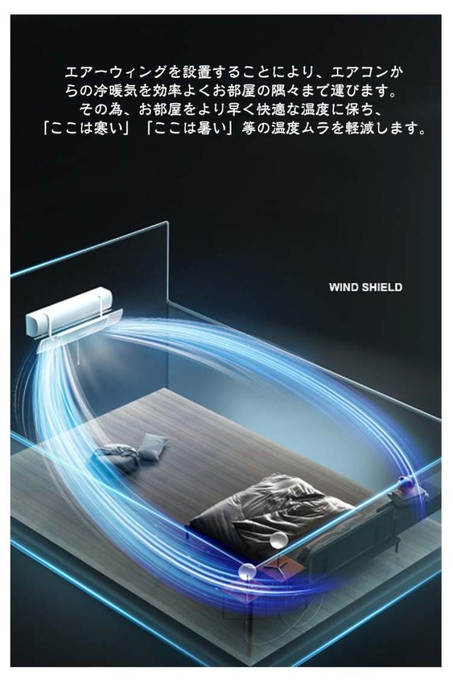 | 【不快な直撃風をブロック】不快な冷暖房の直撃風は身体の冷やし過ぎ、あるいは目やノド・お肌の乾燥などの原因となります。エアーウィングで直撃風をブロックし、身体の不調を防ぎましょう! 【お部屋の温度ムラを改善】エアーウィングを設置することにより、エアコンからの冷暖気を効率よくお部屋の隅々まで運びます。その為、お部屋をより早く快適な温度に保ち、「ここは寒い」「ここは暑い」等の温度ムラを軽減します。 【効率的な環境でコストカット】効率よく冷暖房を運ぶことによって快適な温度を素早く行き渡らせて保つため、「暑がりさん・寒がりさん」がいるお部屋でも、冷暖房の温度調整が可能になります。 【優れた互換性】伸縮範囲60cm-95cm ほとんどのエアコンに対応! 【結露防止】プレートにブラインド設計で、風の強度・流れ調節で、結露防止に! | |