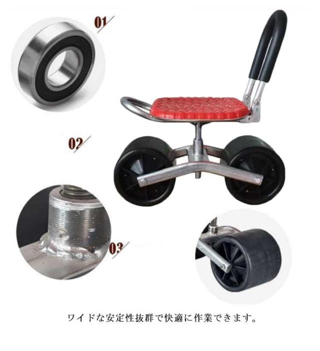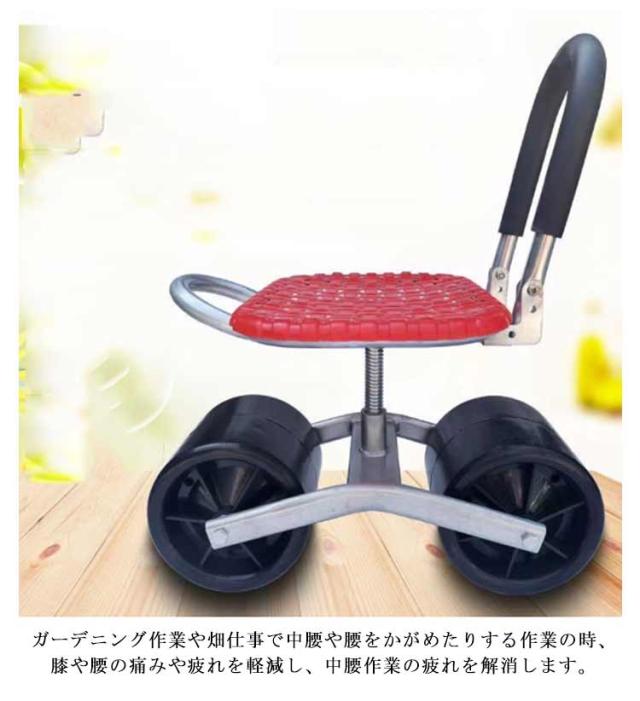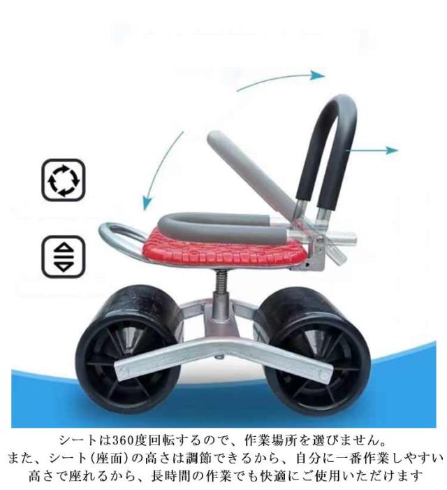 腰掛け台車 園芸用カート 座面 高さ調節 360°回転 背もたれ付き キャスター付き 農作業 椅子 畑仕事 草取り 除草作業 園芸 ガーデニング 作業椅子 作業車 作業イス タイヤ付き 腰掛椅子 移動椅子 移動式 チェア スツール 足腰 腰痛 負担軽減 コンパクト 農作業 便利 グッズ