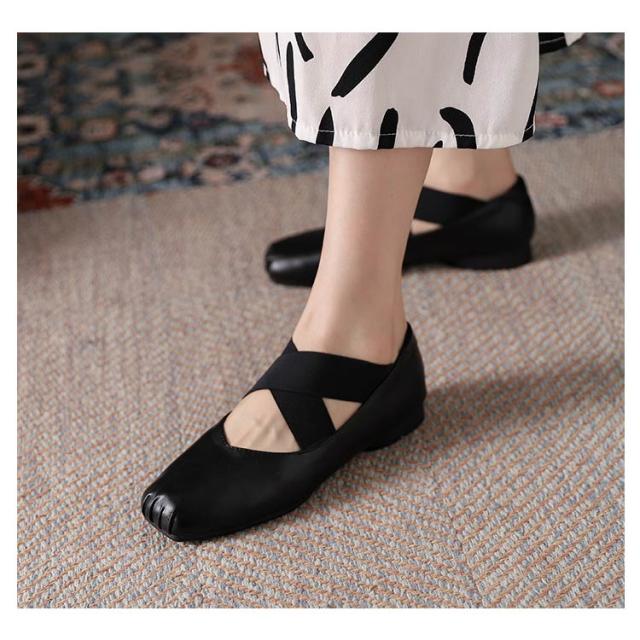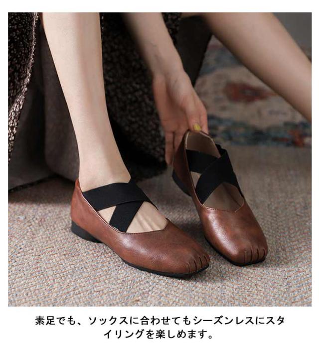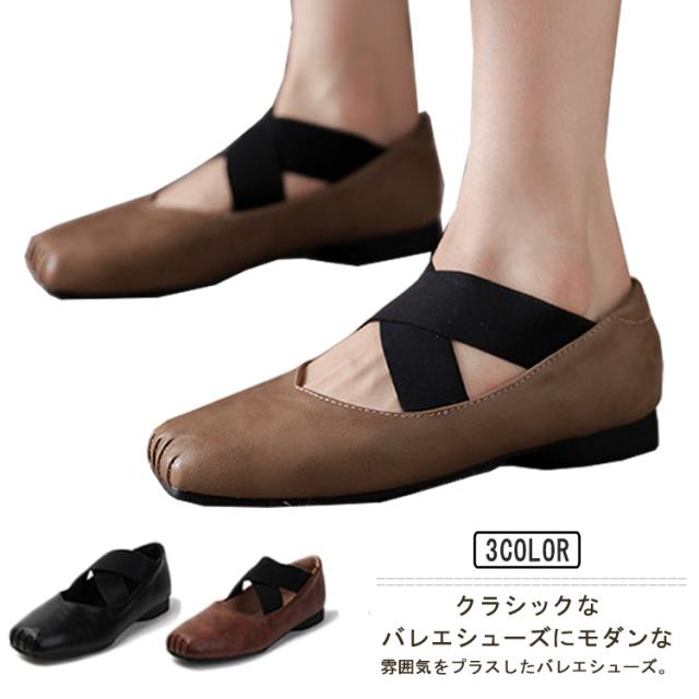 スクエアトゥ バレエシューズ パンプス フラット レディース フラットシューズ ぺたんこ クロスバンド ゴムクロス バレエシューズ 痛くない 歩きやすい 疲れない クロスストラップ パンプス Vカット 本革 牛革 仕事 オフィス 通学 通勤 おしゃれ