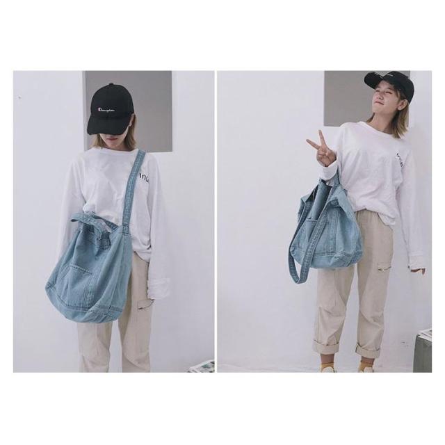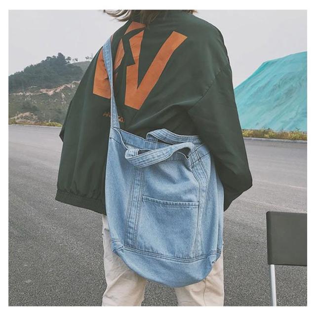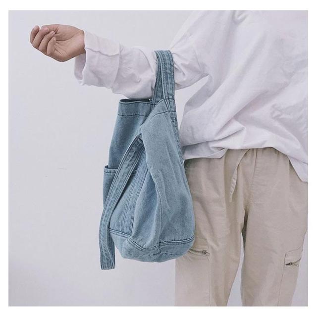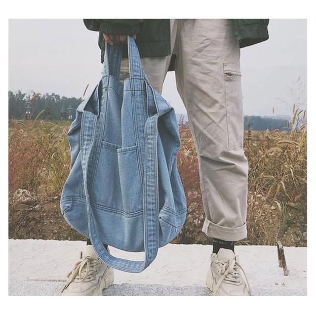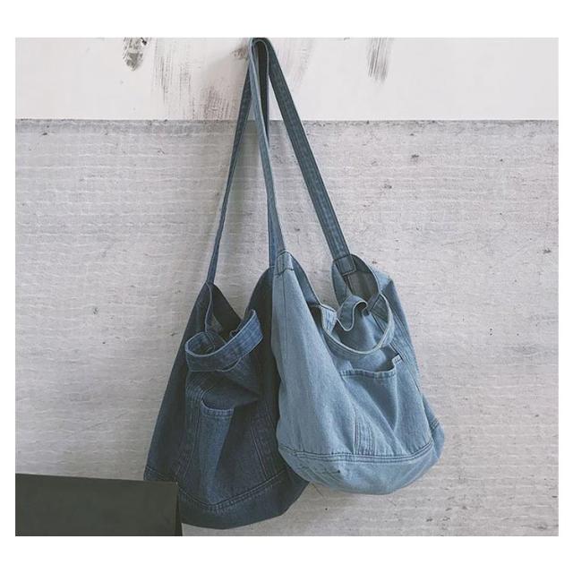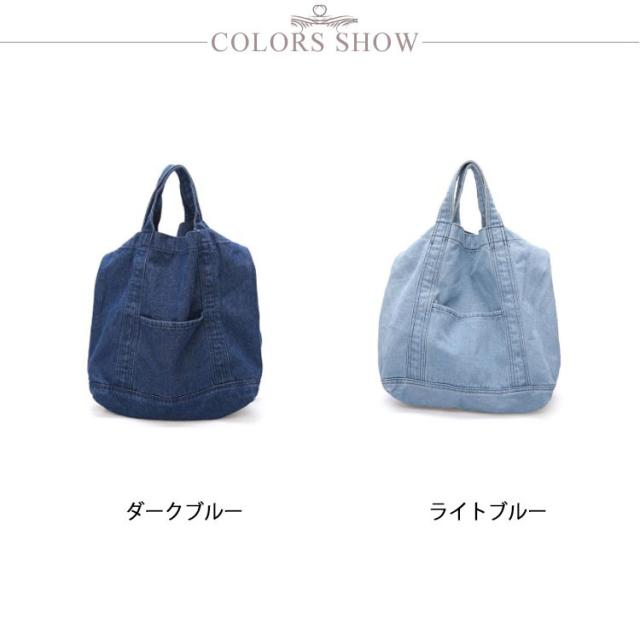 | 大容量が嬉しいデニムトートバッグ しっかり大きくたくさん入るトートバッグ。 デニムの素材感がかわいいので爽やかなコーデに取り入れたいアイテム。 持ち手も柔らかなデニム生地で太めなので肩がけしても疲れにくいです。 かなりの大容量なので荷物が多くても安心のメインバッグサイズです。 | |