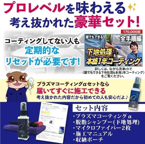 ■豪華セット内容 プラズマコーティングα/脱脂シャンプー(希釈でマルチクリーナーにもなる)/マイクロファイバークロス2枚(エッジレスで傷つきにくい塗布用&拭き上げ用)/施工マニュアル