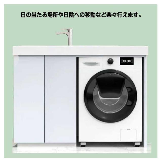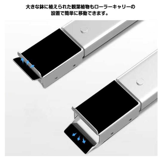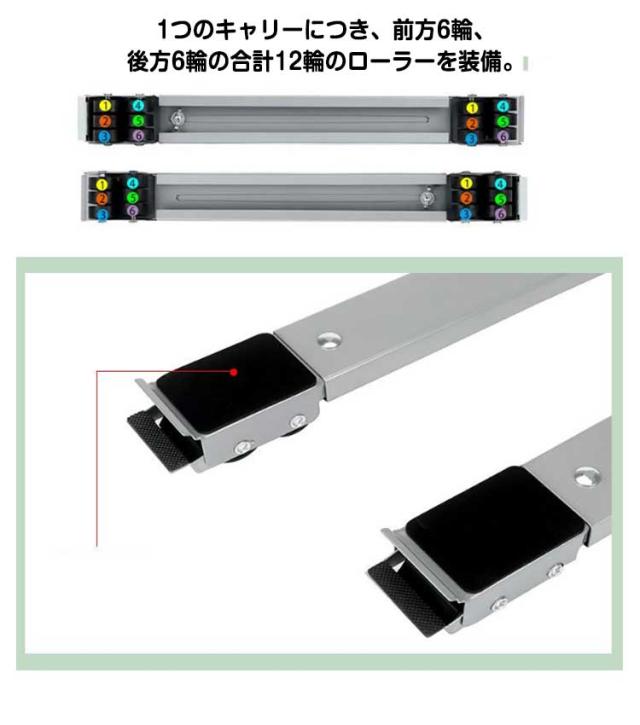 | 横約46.5cm〜71cm!洗濯機伸縮式置き台2個+バールの3点セット。 大きくて持ち運びの難しい家具でも、360度回転式のローラーキャリーを使えば簡単に移動できます。 どんなインテリアでも合うデザイン。 大きな鉢に植えられた観葉植物もローラーキャリーの設置で簡単に移動できます。 日の当たる場所や日陰への移動など楽々行えます。 引き出すだけで普段のお掃除も楽々。 1つのキャリーにつき、前方6輪、後方6輪の合計12輪のローラーを装備。 お好みの長さに調整して、ネジで固定するだけの簡単セッティング。 | |