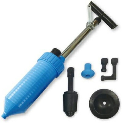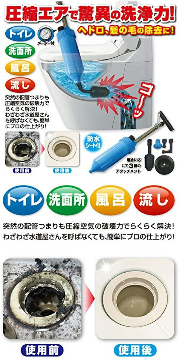 ●トイレ、洗面所、風呂場、流し台のつまりの原因となるヘドロ、髪の毛を空気の力で 押し流して除去します。 ●わざわざ水道屋さんを呼ばなくても、自分で解決できて安心。 ●用途に応じて3種類のアタッチメントと水の跳ね返りにも安心な防水シート付き。 |