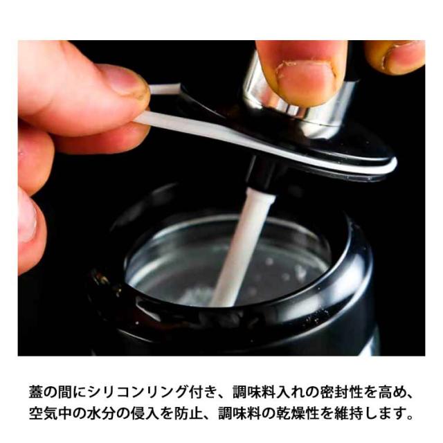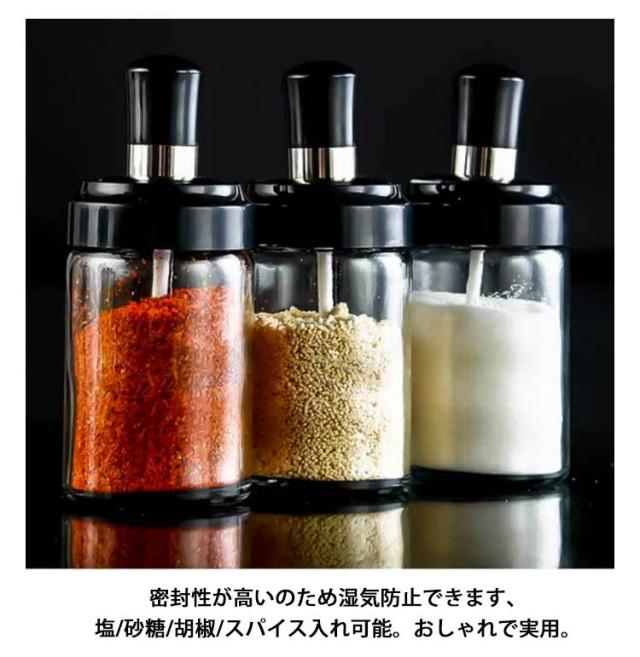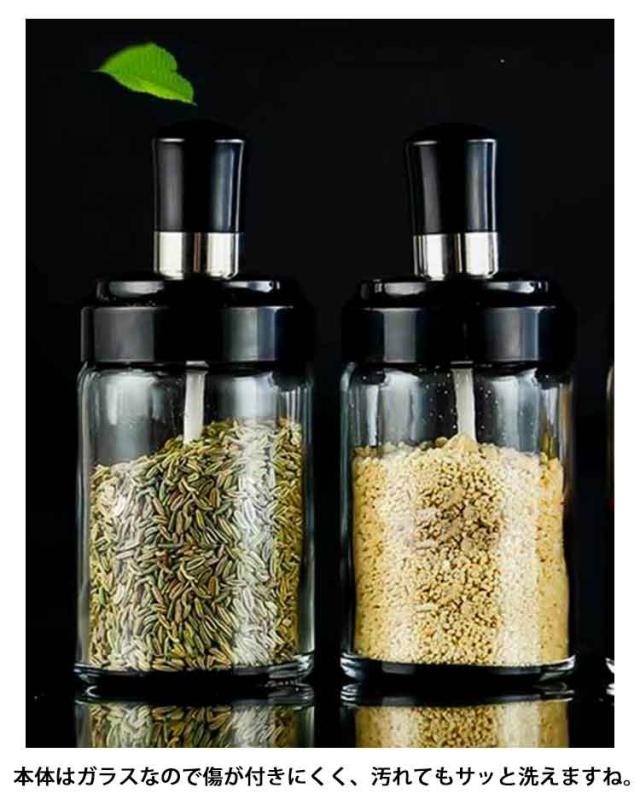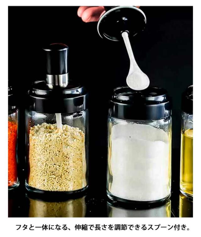 | 【6個セット】【スプーン付き】【片手開閉】【密閉保存】 スプーン付き調味料入れ(6個セット)が登場。 フタと一体になる、伸縮で長さを調節できるスプーン付き。 密封性が高いのため湿気防止できます、塩/砂糖/胡椒/スパイス入れ可能。おしゃれで実用。 蓋の間にシリコンリング付き、調味料入れの密封性を高め、空気中の水分の侵入を防止、調味料の乾燥性を維持します。 本体はガラスなので傷が付きにくく、汚れてもサッと洗えますね。いつまでも衛生的に使えるのはうれしいです。 もちろん、調味料以外のものを入れてもgood! | |