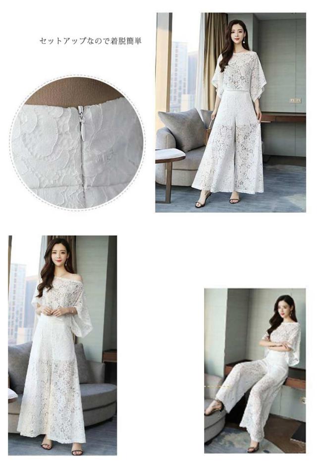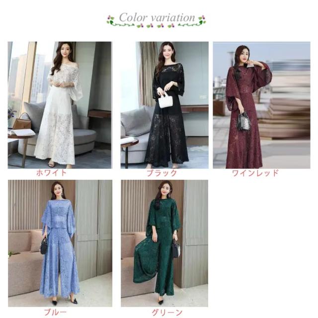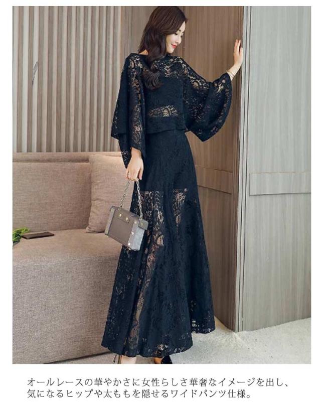 レース パンツドレス 二次会 結婚式 ドレス パーティードレス セットアップ 袖あり ドルマンスリーブ お呼ばれ パーティー 披露宴 ロングパンツ フレアパンツ ワイドパンツ 総レース シースルー 肌見せ レースドレス エレガント 華やか 【送無】