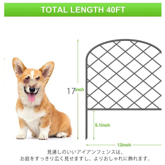 | シンプルで高級感のあるアイアンフェンス10枚セットです。 見通しのいいアイアンフェンスは、お庭をすっきり広く見せますし、よりおしゃれに飾れます。 頑丈なアイアン製品、木製のものより経年劣化が少なです。 ジョイントで連結OK、お庭のサイズや形に合わせて何枚でも連結可能です。 きちんと地面に差し込めば、安定性もばっちりです。 花壇やお庭、家庭菜園などのフェンス、仕切りとして使ったり、中小型犬のドックランフェンスとして使ったり、つる性の植物を絡ませてトレリスとしてもお使いいただけます。 | |