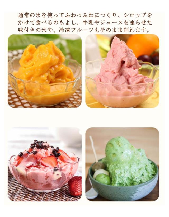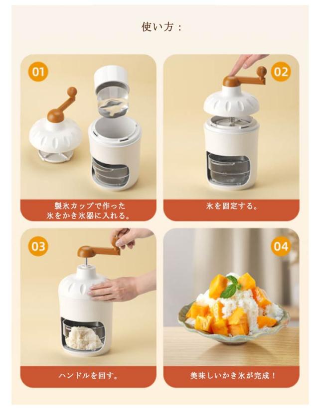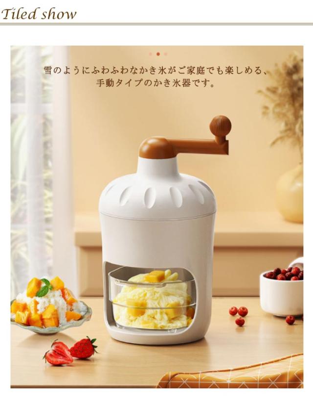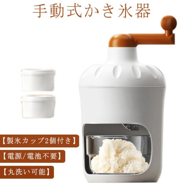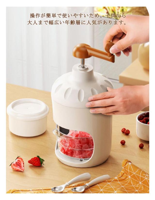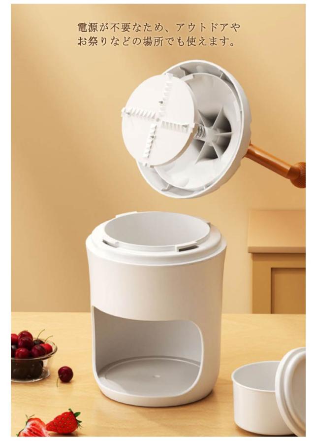 | 【手動式かき氷器】【製氷カップ2個付き】【電源/電池不要】【丸洗い可能】 雪のようにふわふわなかき氷がご家庭でも楽しめる、手動タイプのかき氷器です。 通常の氷を使ってふわっふわにつくり、シロップをかけて食べるのもよし、牛乳やジュースを凍らせた味付きの氷や、冷凍フルーツもそのまま削れます。 かき氷が自宅でも屋外でも楽しめる!雪のようにふわふわな食感が特徴。 専用の製氷カップ付き!製氷カップ2個付属。 操作が簡単で使いやすいため、子供から大人まで幅広い年齢層に人気があります。 電源が不要なため、アウトドアやお祭りなどの場所でも使えます。 使い方: 製氷カップで作った氷をかき氷器に入れる。 氷を固定する。 ハンドルを回す。 美味しいかき氷が完成! | |