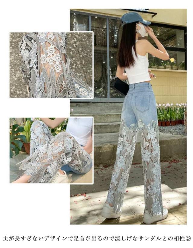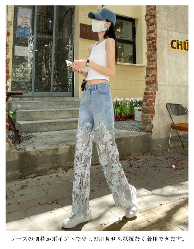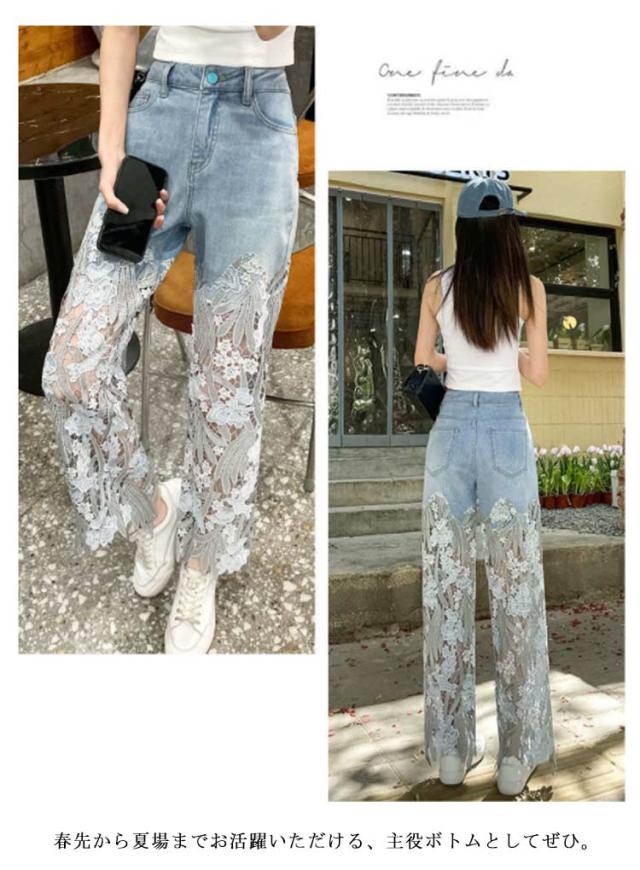 デニム ワイドパンツ レース 切り替え 肌見せ レディース デニムパンツ ロング丈 花柄 レース 刺? 透け感 ロングパンツ ボトムス 美脚 カジュアル 春 夏 ダメージ ジーンズ ジーパン ストレートパンツ ゆったり かわいい 【送無】