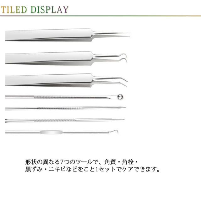| 気になる毛穴の黒ずみもスッキリ!毛穴ケア専用ピンセットです。 形状の異なる7つのツールで、角質・角栓・黒ずみ・ニキビなどをこと1セットでケアできます。 ステンラス製なので、変形・変色せず、長時間ご愛用いただけます。 超極細で先端は幅0.01mm!角栓ピンセットの先端が超極細だから、気になる肌へのダメージも配慮。 収納ケースが付きますので、旅行や出張などの携帯にも便利です。 | |