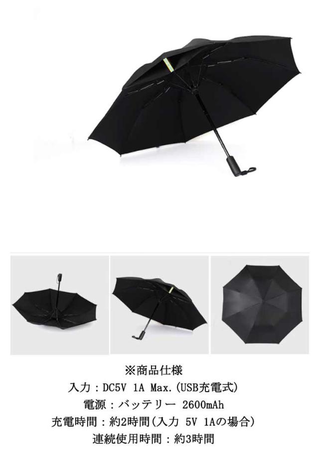 | サイズについての説明 | F 長さ:39cm 直径:約105cm 中骨:8本 重さ:530g 電池容量:2600mAh 使用時間:12時間 |