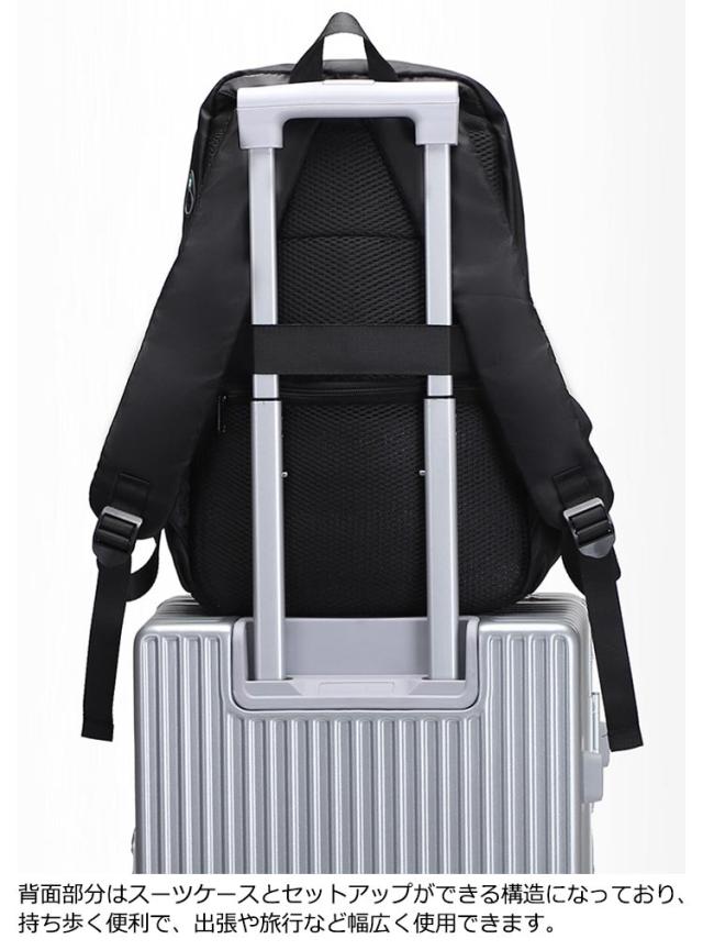 | A4サイズの本や資料はもちろん、15.6インチのパソコンも大丈夫です。大容量で傘、財布、鍵、スマホ、書類、タブレット、着替え服などがきちんと収まります。 良質なファスナーを使用しているため滑らかで使いやすく、耐久性に優れています。丈夫で軽く、柔らかなポリエステル素材を使用しているため、長くお使い頂けます。肩からベルトがずれ落ちることがなく、体にフィットして背負えます。 高級ポリエステルを採用して、手触りがいいだけではなく、耐久性にも優れています。人間工学に基づいて設計されて通気性抜群、軽量なので、長時間背負っても疲れにくい造りとなっております。 いつでもサッとUSB充電可能。あなたがお持ちのバッテリ一と接続して充電しながら楽しくスマ一トに観光をすることができます。 背面部分はスーツケースとセットアップができる構造になっており、持ち歩く便利で、出張や旅行など幅広く使用できます。 | |